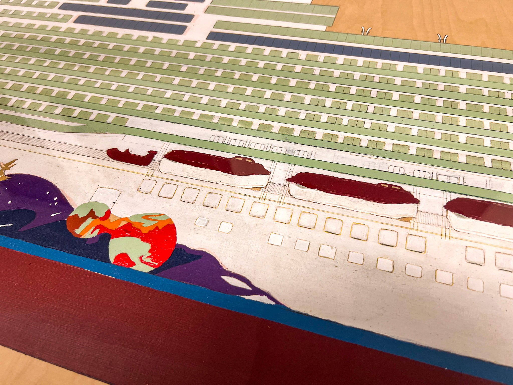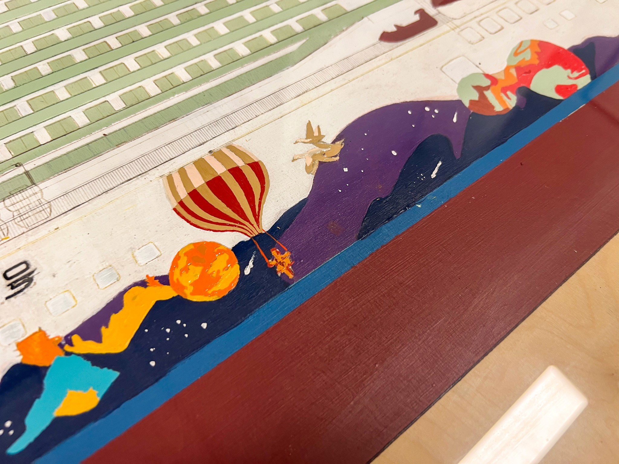 I worked from reference materials and color studies to maintain the balance of the ship’s lively gradient colors, translating them into brushstrokes that feel both smooth and energetic.